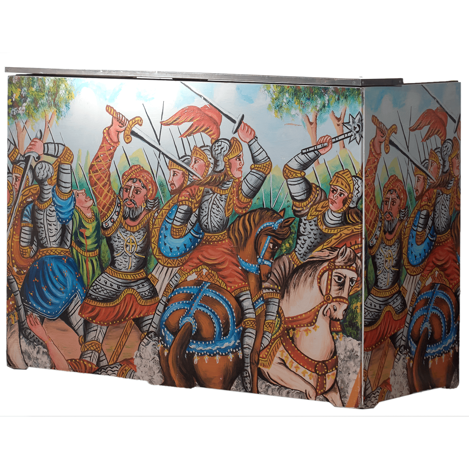 Bancone con rivestimento decorativo in stile siciliano, altezza 102 cm e lunghezza 150 cm. Perfetto per eventi a tema o angoli degustazione.