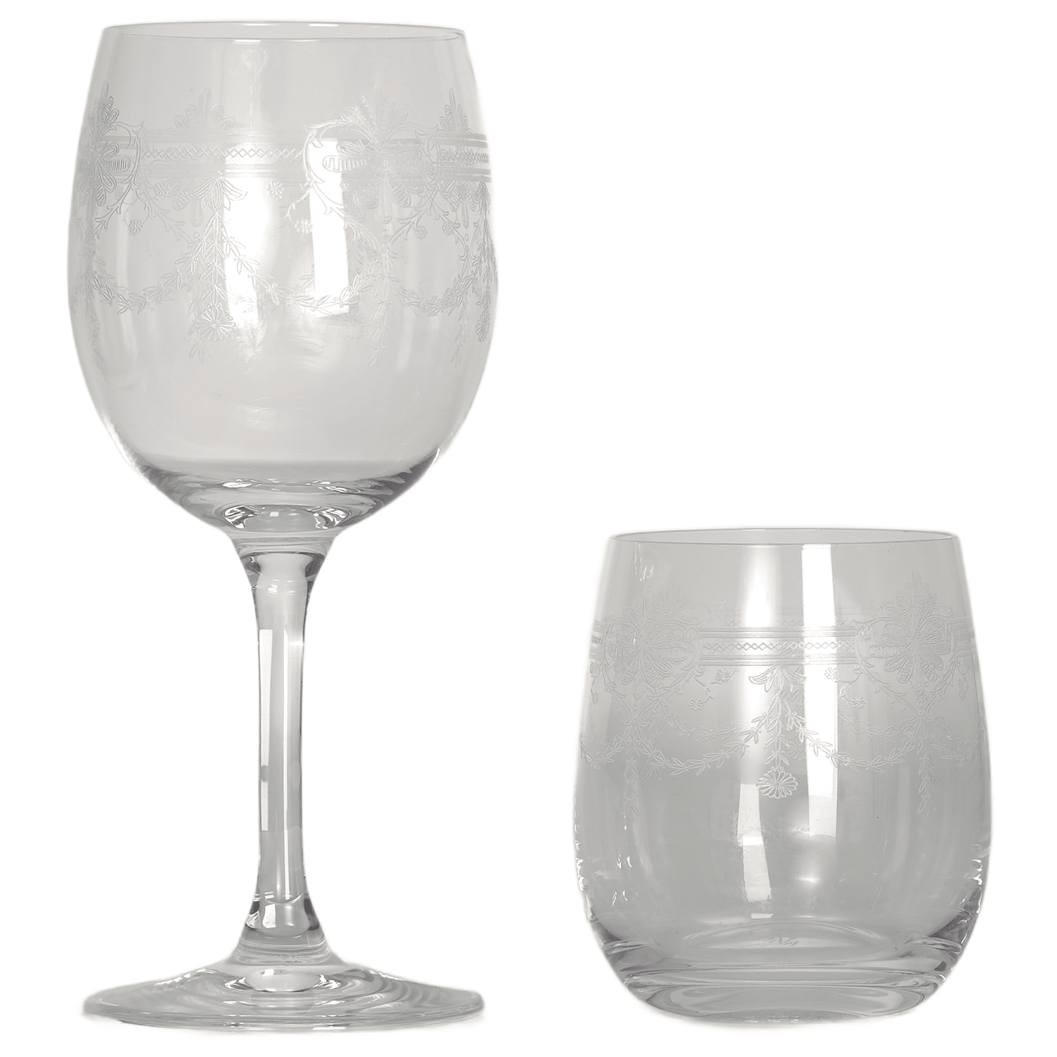 Bicchieri da acqua e vino con lavorazione pantografata. Eleganti e decorativi, ideali per mise en place raffinate in eventi e cerimonie.