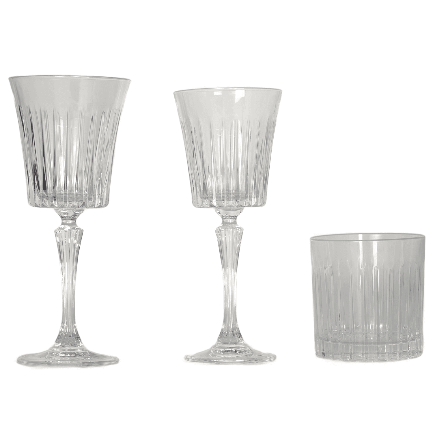 Set composto da calice vino, calice acqua e bicchiere acqua della linea Timeless. Ideali per mise en place raffinate durante eventi e cerimonie.