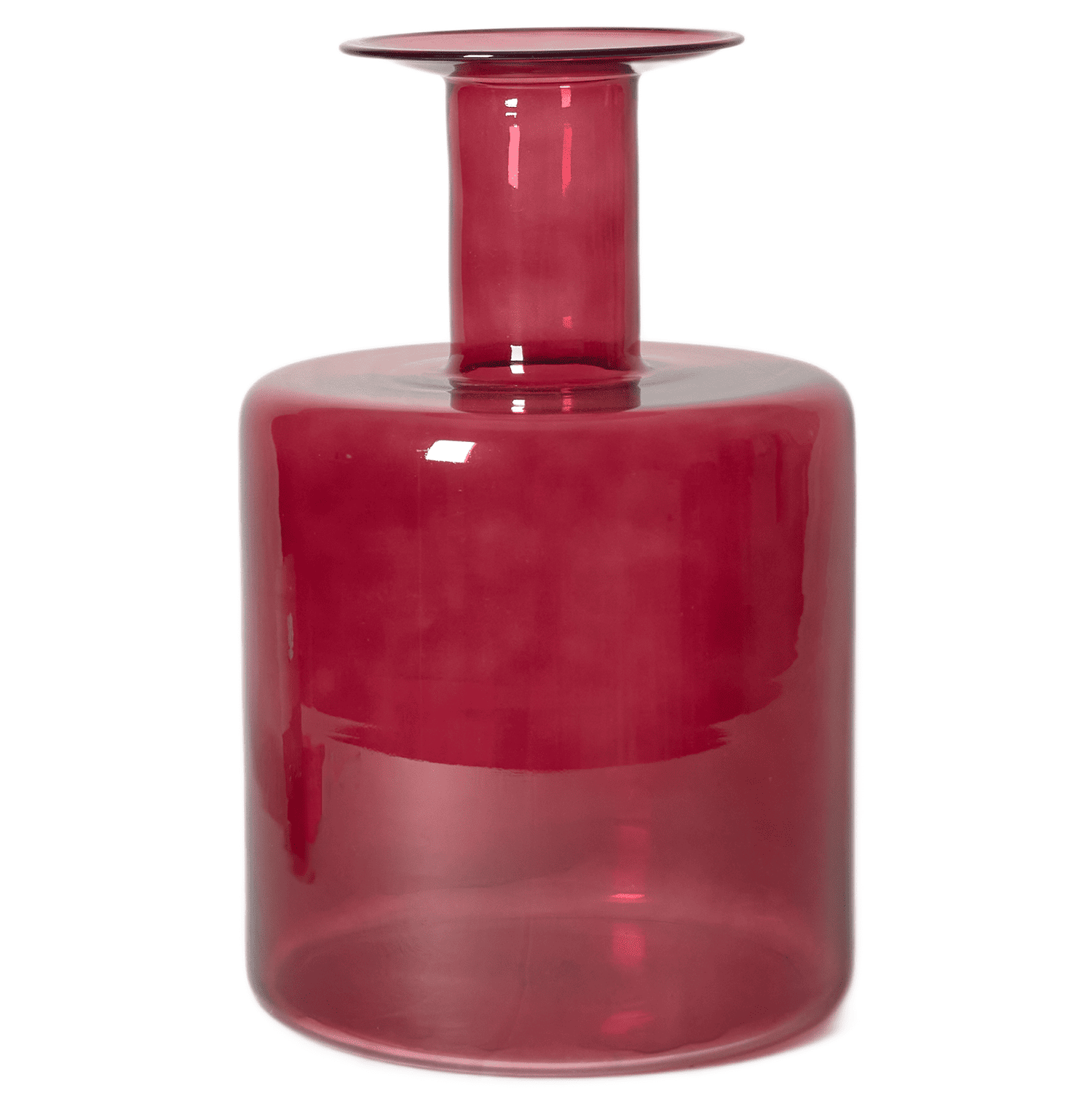Bottiglione decorativo in vetro color porpora, dal design moderno e minimale. Ideale per allestimenti scenografici, tavoli tematici o angoli decorativi durante eventi e cerimonie.