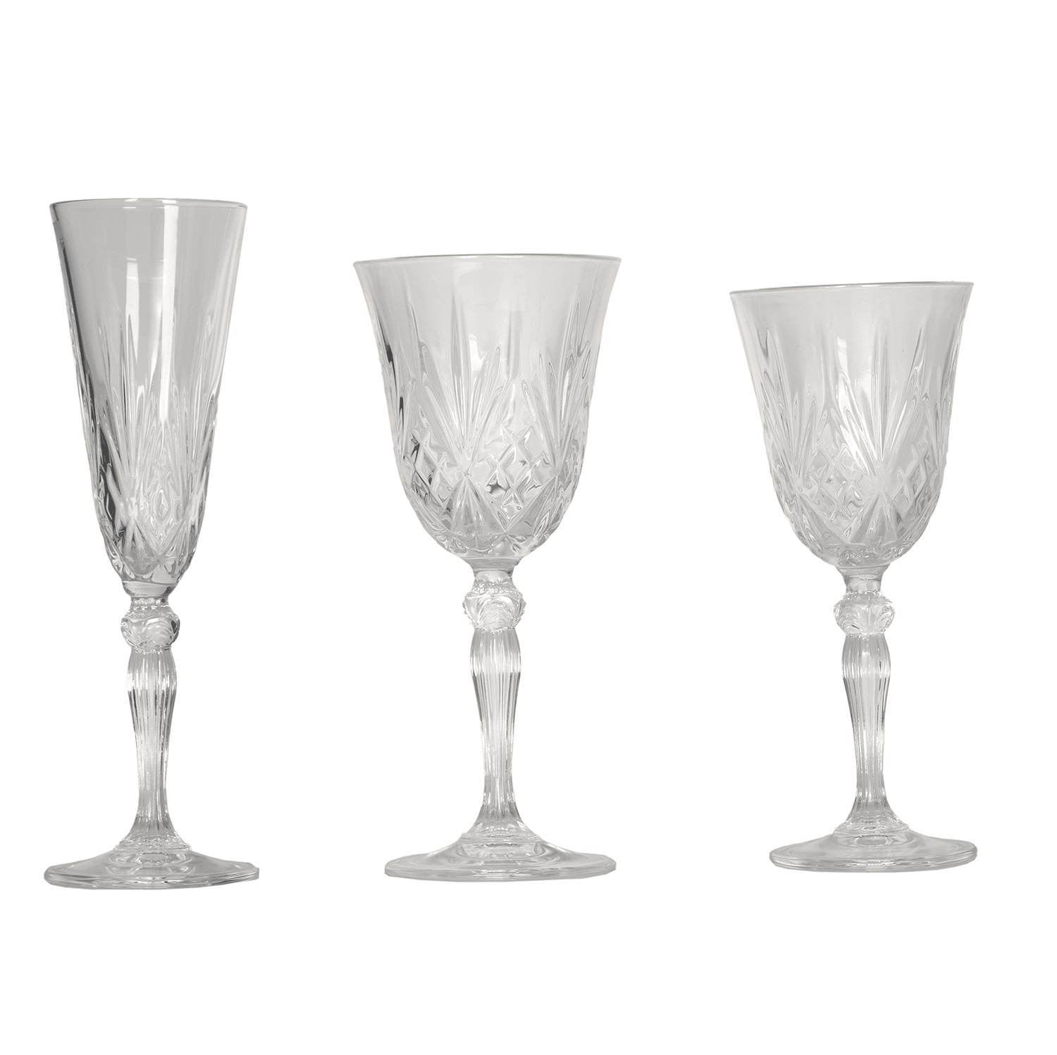 Set di calici Melodia per vino, acqua e flute. Ideali per mise en place raffinate durante cerimonie ed eventi eleganti.