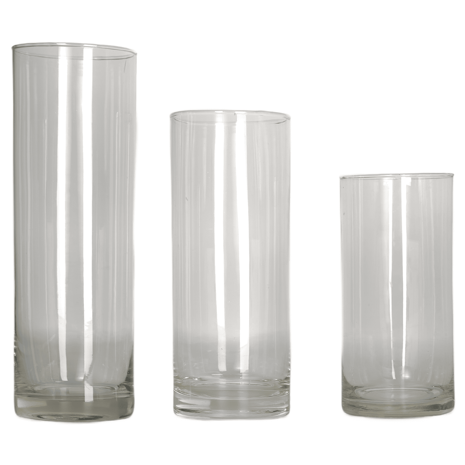 Tris di ampolle cilindriche in vetro liscio, altezze 15, 20 e 25 cm. Ideali per allestimenti eleganti, decorazioni con fiori o candele durante eventi e cerimonie.