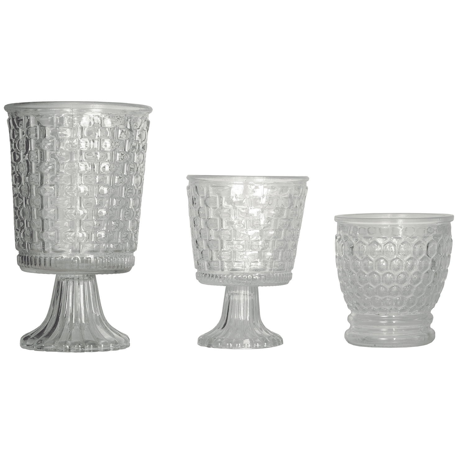 Set di tre coppe in vetro intagliato. Ideali per allestimenti eleganti, centrotavola o decorazioni floreali durante eventi e cerimonie.